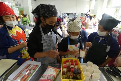 塩、コショウ、しょうゆ、かつお節を取りに来る子供たち。