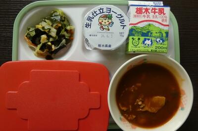 今日の給食は、ハヤシライス、海藻サラダ、栃木県産ヨーグルト、ごはん、牛乳でした。エネルギー659kcal、たんぱく質18.2g、脂質20.4gでした。ごちそうさまでした。