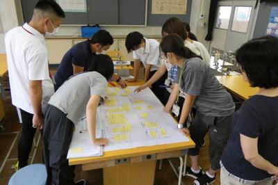研究の視点に基づき、成果と課題について気付いたことを付箋紙で出し合いました。