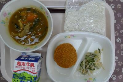今日の給食は、カレーうどん、焼きメンチカツ、もやしときゅうりのあえもの、牛乳でした。エネルギー667kcal、たんぱく質24.4g、脂質27.4gでした。ごちそうさまでした。