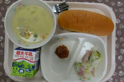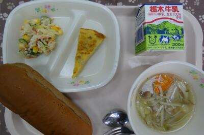 今日の給食は、アンサンブルエッグ、ササミと野菜のサラダ、きのことベーコンのスープ、黒糖パン、牛乳でした。エネルギー599kcal、たんぱく質23.7g、脂質22.3gでした。ごちそうさまでした。