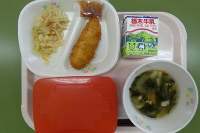 今日の給食は、白身魚フライ・ソース、ごま酢和え、小松菜のみそ汁、ごはん、牛乳でした。エネルギー589kcal、たんぱく質21.4g、脂質18.0gでした。ごちそうさまでした。