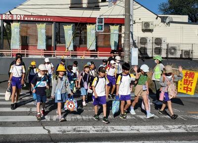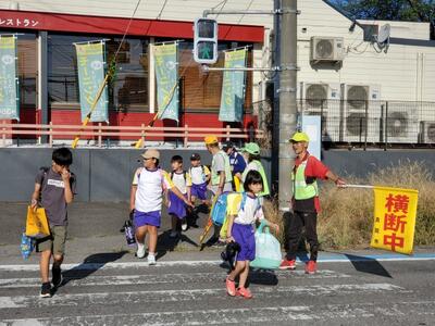 「いってらっしゃーい!」「おー、がんばれー!」スクールガードさんは子供たちにたくさん声を掛けてくださっていました。本当にありがたいことです。
