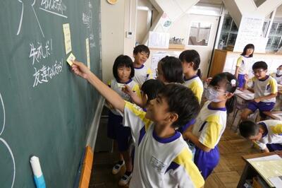 自分の立ち位置(考え)を黒板に示す子供たち。