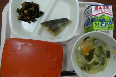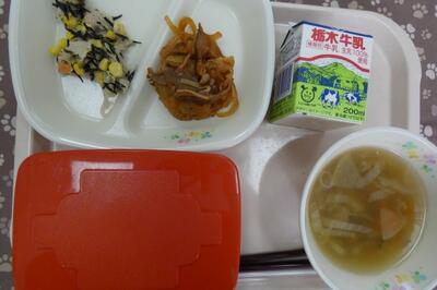 今日の給食は、ホッケ文化干、ひじきの炒め煮、野菜のみそ汁、ごはん、牛乳でした。エネルギー547kcal、たんぱく質25.2g、脂質15.0gでした。ごちそうさまでした。