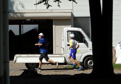 「おはようございまーす!」朝、スクールガードさんが見守る中、道路を安全に横断する子供たち。今日一日頑張れば、また明日はお休みです。