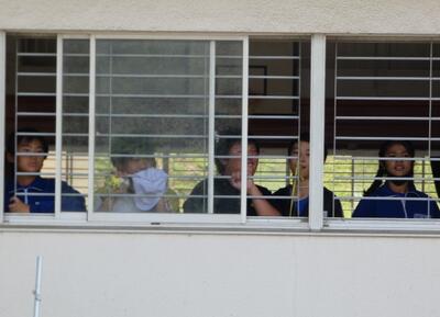 体育館から、校庭のリカバリーチャンスを見守っている捕まっちゃった人たち。