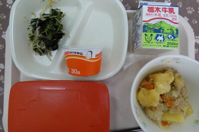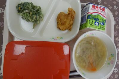 今日の給食は、とりのから揚げ、ごぼうのサラダ、いものこ汁、ごはん、牛乳でした。エネルギー608kcal、たんぱく質22.3g、脂質20.7gでした。ごちそうさまでした。