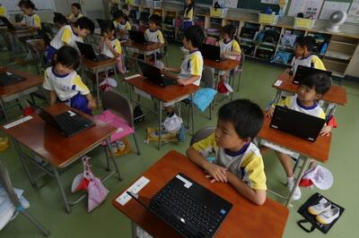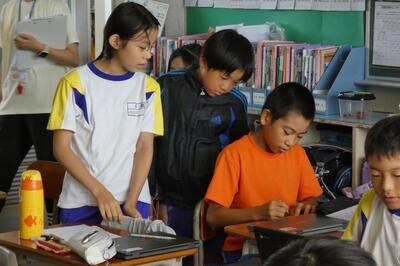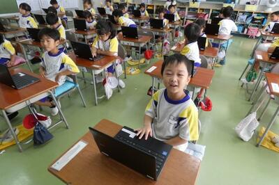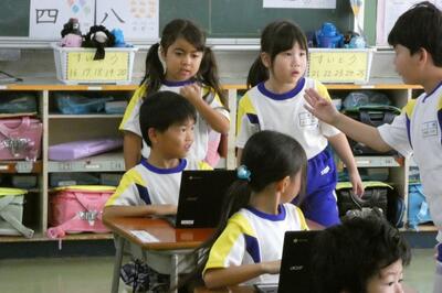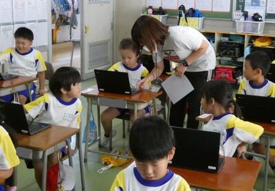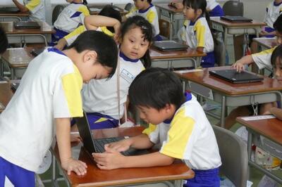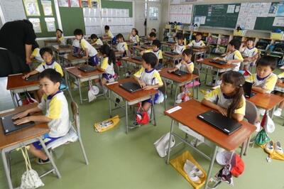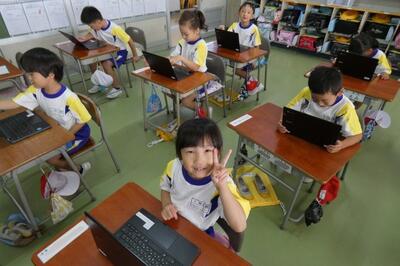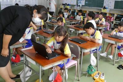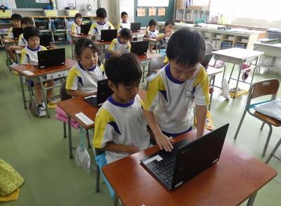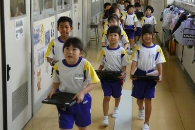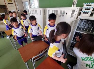 タブレット端末が、子供たち一人一人に配られました。手にしたパソコンには、自分の名前が貼ってあります。