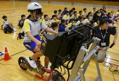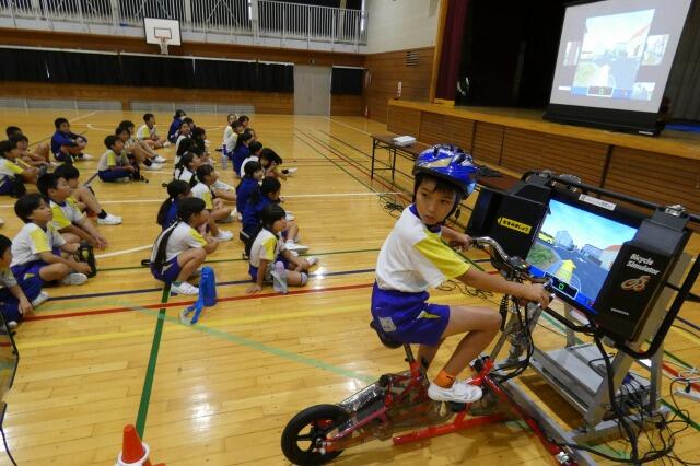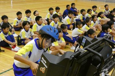 後半は、代表児童が実際に自転車に乗り、自転車シミュレーターで実践的な講習を行いました。