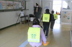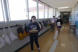 1~5年生から6年生に感謝の記念品を贈呈します。代表児童が6年生教室に向かいます。