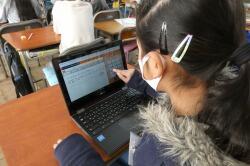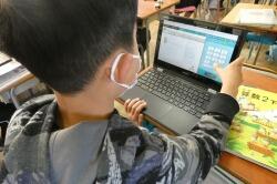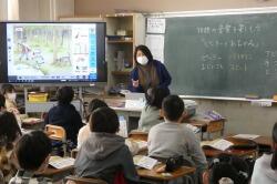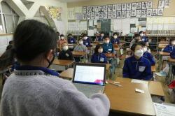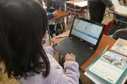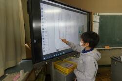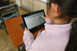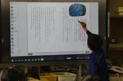 3年生の国語科では、ある国について調べたことをタブレット上でまとめ、発表していました。