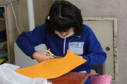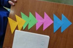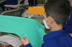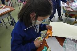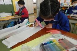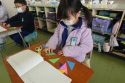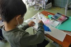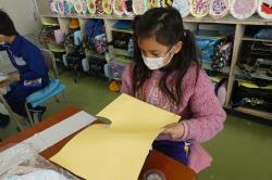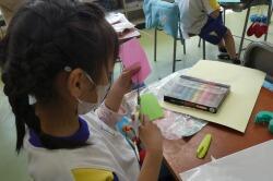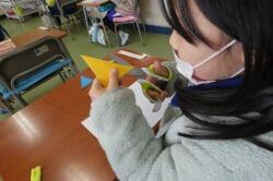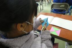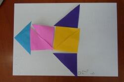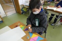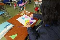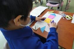 この授業は折り紙を切っていますが、図工ではなく、算数なのです。子供たちは折り紙を組み合わせていろいろな形を作り、用紙にのりで貼っていきます。