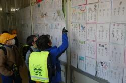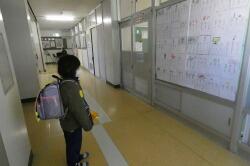 昨日今日、登校時に1年生が廊下で立ち止まり何かを見ています。