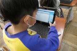 タブレットを保管庫から教室に持って帰る途中、ノートコンクールの優秀作品を見ていました。さらに歩を進め、教室をのぞいてみるとこんな姿が。