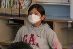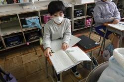 今日の算数は位置を示す学習です。ある地点から東へ20M、北へ30Mのような説明を受け、正しい位置を示します。先生からの説明をしっかりと聞きます。