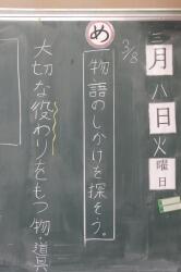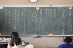 出てきた考えを黒板に書き、みんなで共有しています。物語の中に出てくる物や道具が意味をもっています。お子様と一緒に教科書の物語を読んでみてはいかがでしょうか。