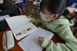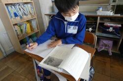 5年生の国語では、医師でありマンガ家である手塚治虫の伝記を読んでいます。今日は電気に書かれている出来事や行動、言葉を整理し、ワークシートにまとめる活動を行いました。