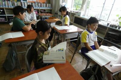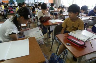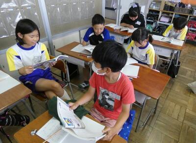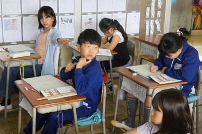 全員で音読した後、子供たちはペアになって1文ずつ交替で読み合いました。