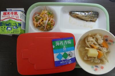 今日の給食は、いわしの梅煮、切干大根のサラダ、根菜のごま汁、ごはん、のり香味、牛乳でした。エネルギー655kcal、たんぱく質25.9g、脂質22.3gでした。ごちそうさまでした。
