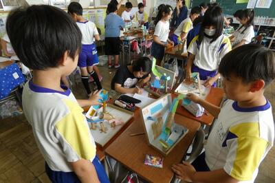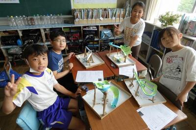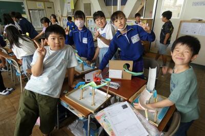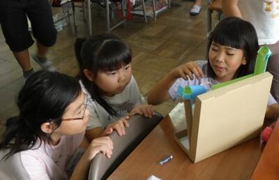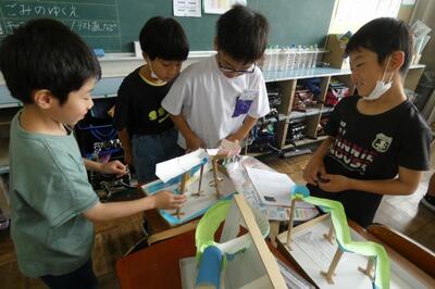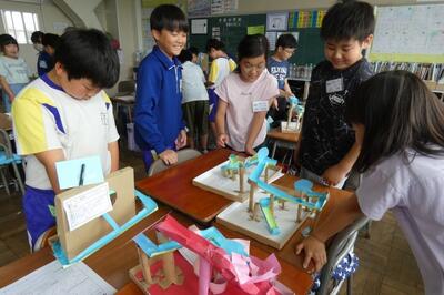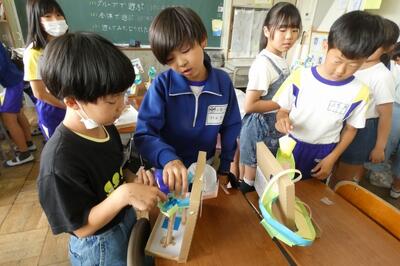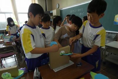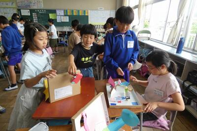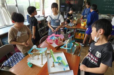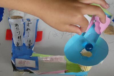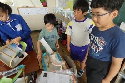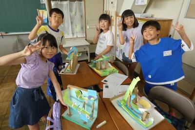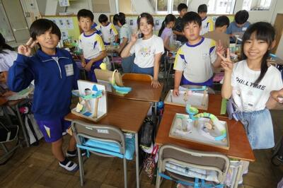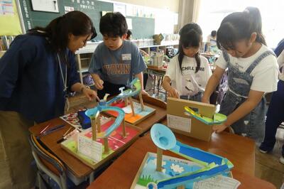 4年3組の図画工作科の授業におジャマしました。完成した「コロコロガーレ」で、今日はクラス内で互いに友達の作品で遊び、その感想を伝え合いました。