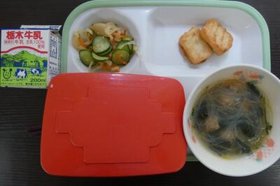 今日の給食は、とうふナゲット、たくあんあえ、肉団子と小松菜のスープ、ごはん、牛乳でした。エネルギー600kcal、たんぱく質17.4g、脂質21.4gでした。ごちそうさまでした。