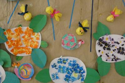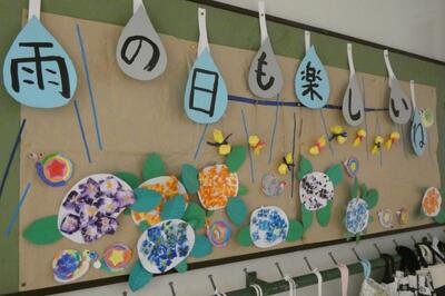 教室棟2階の掲示板は、先日までこいのぼりが泳いでいましたが、今はカタツムリやカエルが歌っています。