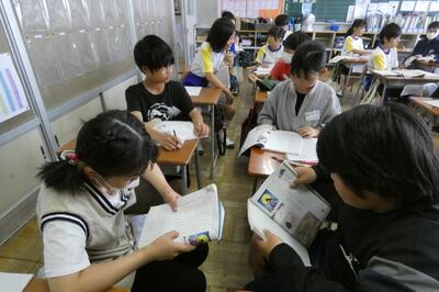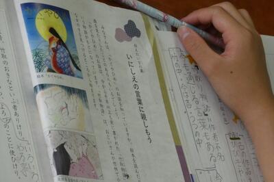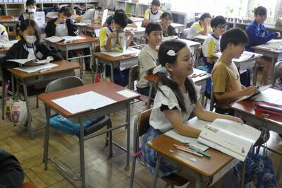 5年4組の国語科の授業におジャマしました。「いにしえの言葉に親しもう」という学習テーマのもと、みんなで「竹取物語」を読んでいました。