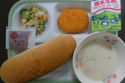 今日の給食は、野菜入りコロッケ、アーモンドサラダ、クラムチャウダー、コッペパン、ミックスジャム、牛乳でした。エネルギー699kcal、たんぱく質22.4g、脂質25.9gでした。ごちそうさまでした。