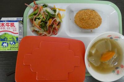 今日の給食は、かつおカツ、春野菜のあえもの、けんちん汁、ごはん、牛乳でした。エネルギー616kcal、たんぱく質23.2g、脂質18.9gでした。ごちそうさまでした。