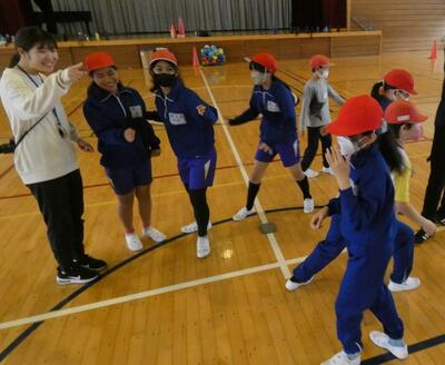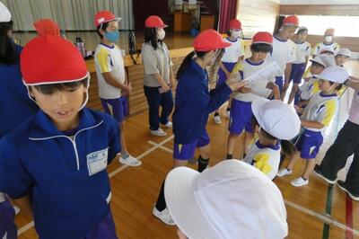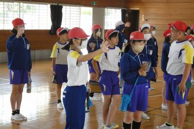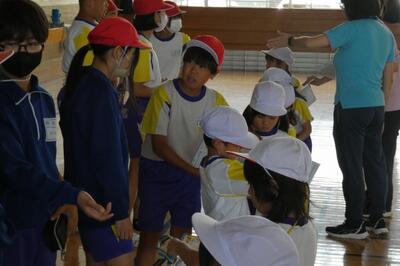 バディとなって、シャトルランのやり方を教えてあげる6年生。