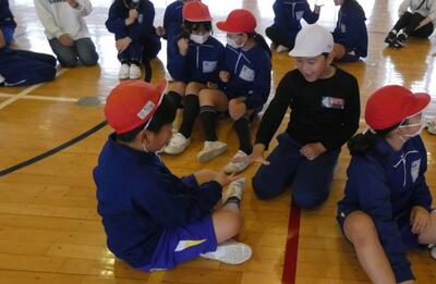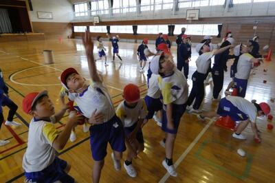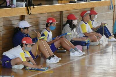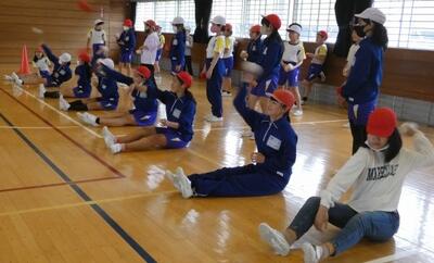 最後に、学んだことを生かして、クラス全員で紅白玉を体育館2階へ1つ残さず投げ上げます。その時間を計りました。