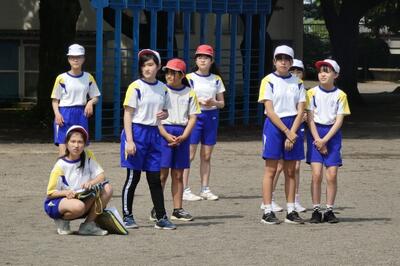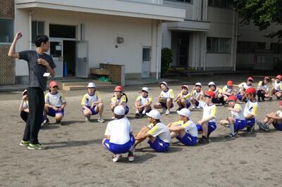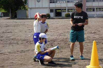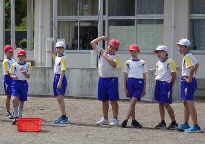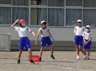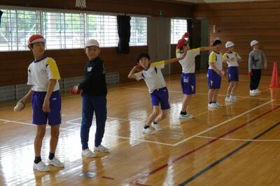 こちらはソフトボール投げ会場です。先生が、けが防止のための運動やボールの握り方について指導をしています。(この後の先生のお手本投げに、みんなビックリ!校庭の防球ネットを越えなくてヨカッタ)