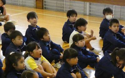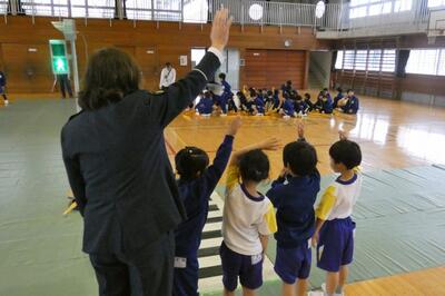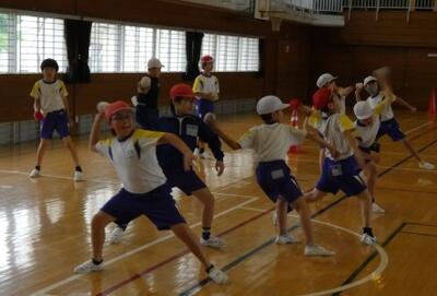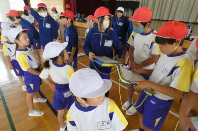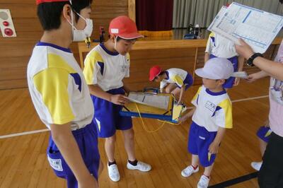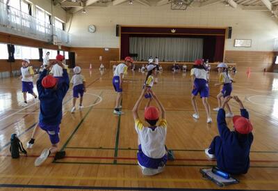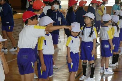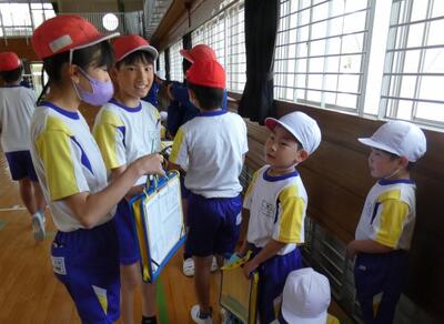 現在、全校生で体力テストを実施中ですが、今日は6年2組のお兄さんお姉さんが、1年3組の皆さんのシャトルランのお手伝いをしました。