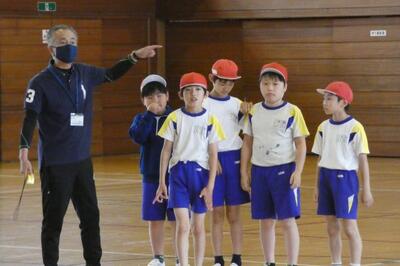 友達の試技を見ながら、投げるフォームをイメージする子供たち。