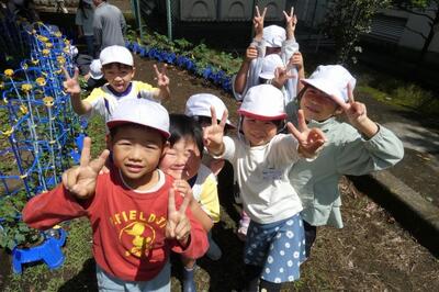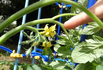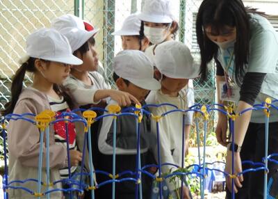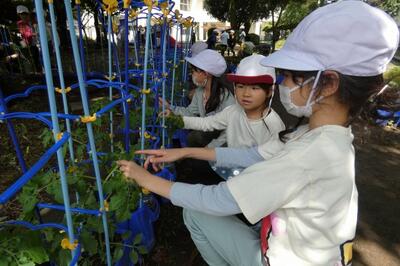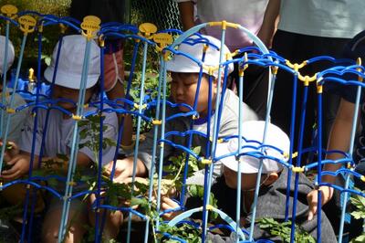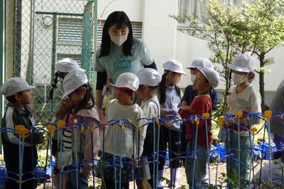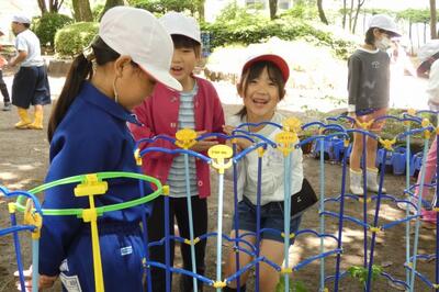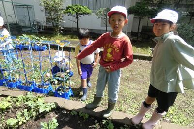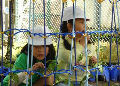 2年3組が、生活科の授業で中庭に出てきたので、おジャマしました。鉢に植えたミニトマトの苗がぐんぐん生長しているので、支柱を立てていました。