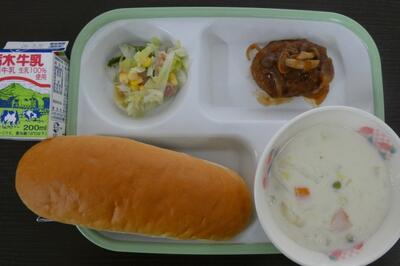 今日の給食は、ハンバーグのデミソースかけ、アスパラのサラダ、白菜のクリームスープ、ミルクコッペ、牛乳でした。エネルギー664kcal、たんぱく質30.0g、脂質24.7gでした。ごちそうさまでした。