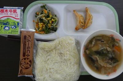 今日の給食は、広東風ラーメン、揚げぎょうざ、野菜と卵のあえもの、ウエハースココア、牛乳でした。エネルギー610kcal、たんぱく質23.4g、脂質22.0gでした。ごちそうさまでした。