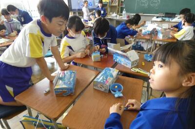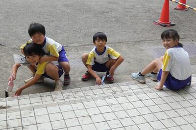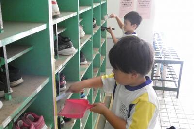 休み時間に、一生懸命に靴箱掃除をしている1年3組の子供たち。