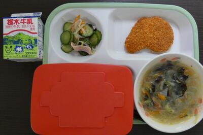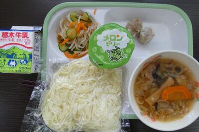 今日の給食は、野菜入り焼き肉、中華くらげサラダ、ワンタンスープ、ごはん、牛乳でした。エネルギー650kcal、たんぱく質25.1g、脂質21.5gでした。ごちそうさまでした。