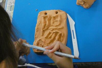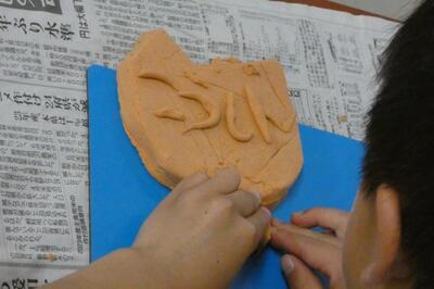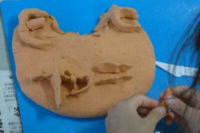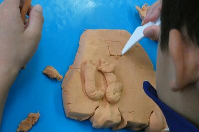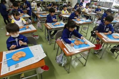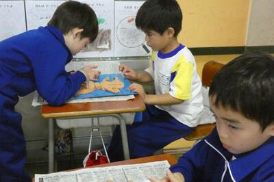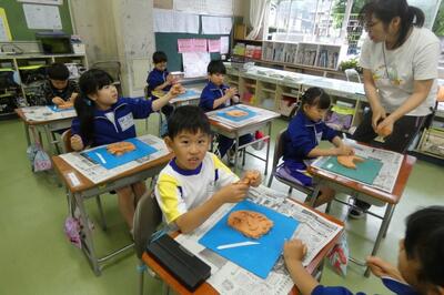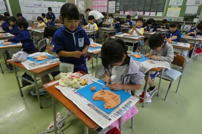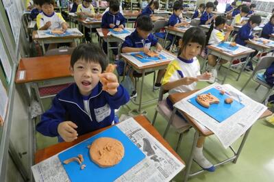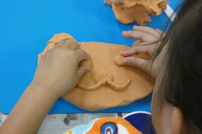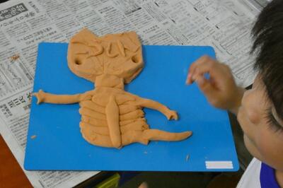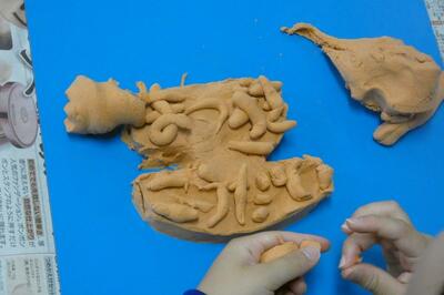 制作と振り返りカード書きが終わった児童は、粘土で好きなものを作っていました。