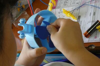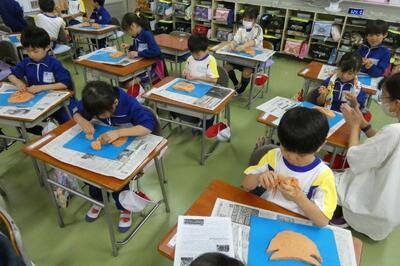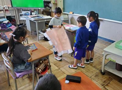 四角形の透明の板に、透明のカラーシートを貼って、うちわや窓飾りを作っていました。子供たちは、光を通して映る形や色を楽しめるように、カラーシートを思い思いの形に切って貼っていました。