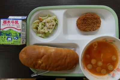 今日の給食は、焼き牛肉コロッケ・ソース、イタリアンサラダ、パスタスープ、丸パン、牛乳でした。エネルギー613kcal、たんぱく質19.2g、脂質22.6gでした。ごちそうさまでした。
