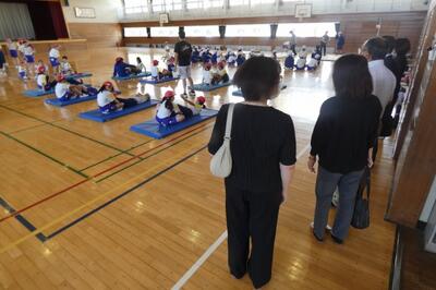 大きな声で準備体操とあいさつをした後、グループに分かれてまずはマットの上を一人ずつジャンプ。