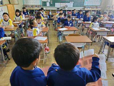 その後で、2年4組におジャマしました。学校探検の振り返りをしていました。