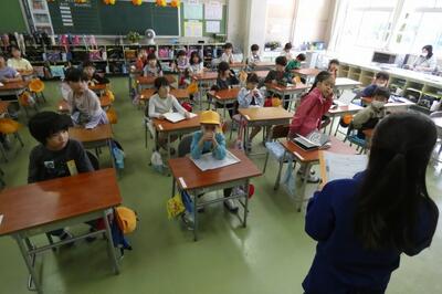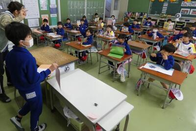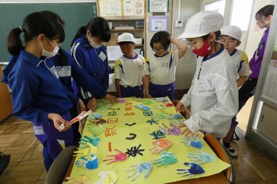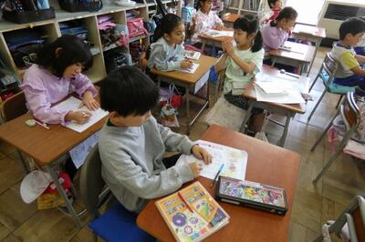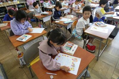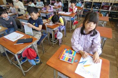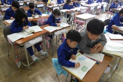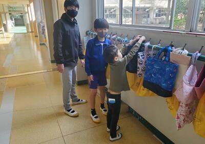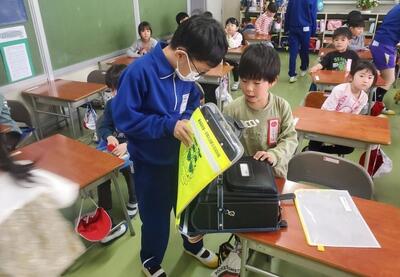 朝の1年生教室の様子です。6年生が、登校した1年生に、荷物の整理や提出物の出し方などを優しく丁寧に教えてくれています。スバラシイ!