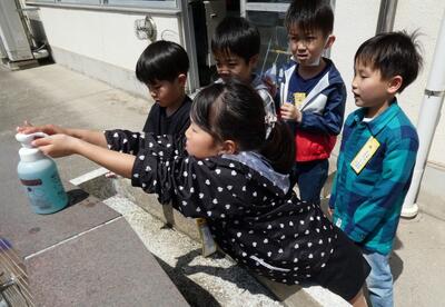 給食当番でない子も、石鹸でよく手を洗って準備をします。