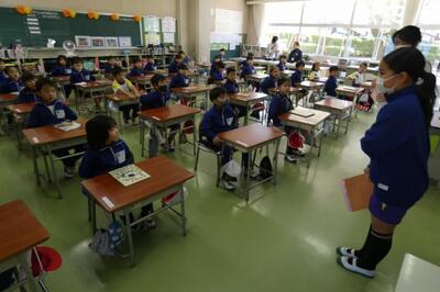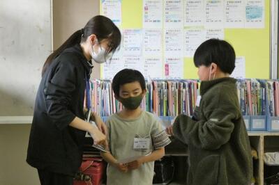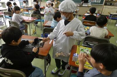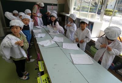 4校時、当番の子供たちが早めに白衣に着替えます。
