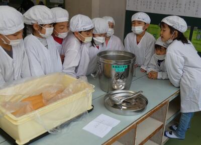 「いいにおい・・・」食缶の中が気になる当番の子供たち。