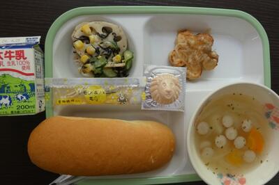 今日15日は、「いちごの日給食」でした。花型とうふハンバーグ、レンコンひじきサラダ、ファルファーレスープ、レアチーズ(いちご)、コッペパン、ハニーレモン、牛乳をいただきました。エネルギー657kcal、たんぱく質22.2g、脂質24.5gでした。ごちそうさまでした。